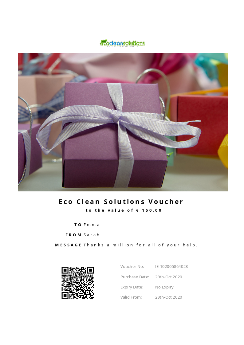 Eco Clean Solutions allows you to purchase instantly printable gift vouchers, special offers and tickets using the Voucher Connect platform.